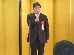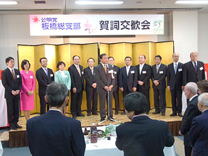 まず、党板橋総支部所属議員全員が登壇し、たちばな正剛総支部長(都議会議員)が主催者を代表して挨拶を行いました。昨年の区議会議員選挙におけるご支援に対する御礼や、東日本大震災に対する区議団による支援活動や、都議会における復興支援策の実現など、地方議員が率先して被災地の救援に動いたことなどを紹介しました。
