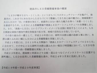 「LEDが魅せるまち・とくしま」というまちづくりのキャッチフレーズを掲げて、地域資源であるLEDの要素を加えて、他都市にはない新たな魅力をもつ「水都・とくしま」を創造し、LEDアートフェスティバルを開催。