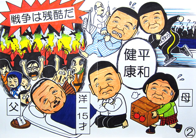 はぎわら洋一の父は、戦争に行った経験からいつも、 "戦争の残酷さと、平和の大切さ"を洋一少年に諭して聞かせていました。厳格で曲がったことが大嫌いな父。厳しくも温かかった父。そんな男らしい父が大好きでした。洋一少年が15歳になったある日、父は病に倒れ、なんと48歳の若さで突然この世を他界。悲しみに暮れる暇もなく、母親は寝る間も惜しんで働き、女手一つで必死に育ててくれました。