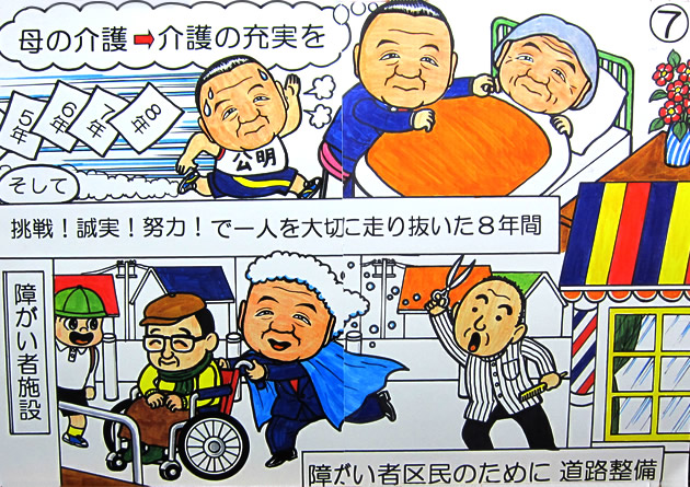 はぎわら洋一は75歳で医者から痴呆症(ちほうしょう)との診断を受けた母を板橋に呼びよせ、以来9年間、84歳で亡くなるその日まで介護(かいご)し続けました。この経験から介護の充実への願いは切実(せつじつ)な問題として、はぎわら洋一は誰よりも身近に感じています。