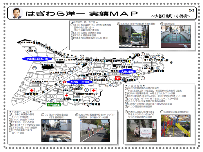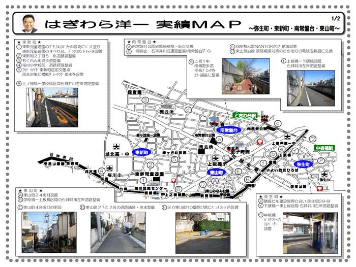 約9年前にウオーキングのつまずきや段差が自転車通行に危険なので安心安全な通行ができるように、道路整備補修をしてくださいとの相談を受けました。以来毎年計画的に大谷口北町、南常盤台、東山、弥生町、小茂根と石神井川沿い道路整備を進めています。
